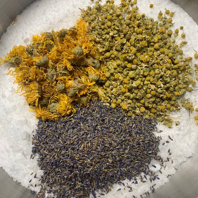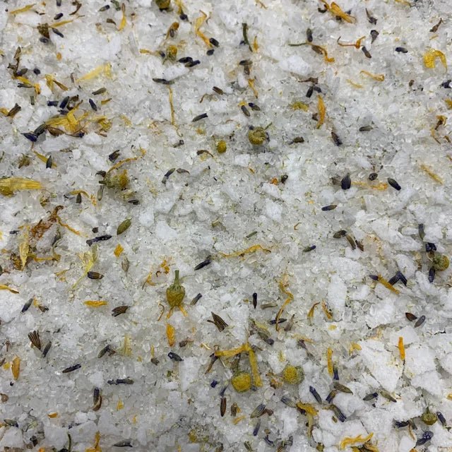 This soak contains lavender and chamomile essential oils as well as dried lavender, chamomile, and calendula flowers. Perfect before bed, at the end of a long day.